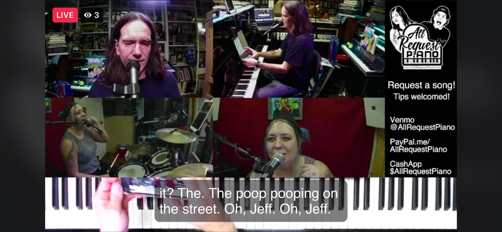 That was one of the most ridiculous and fun livestreams I’ve done with Heather. Right from our first note, we were laughing about the “auto captions” which were popping up so bizarrely wrong as we were talking and singing! The tiny keytar made an appearance for “Last Christmas” which was supposed to be “This Christmas”, but I’ll wait to play it until Next Christmas. We had a slide whistle doing random melodies, and the melodica was used for “Don’t Stop Believin’”. Heather is truly a joy to work with, and I’ve had so much stress-relief playing with her through all of 2021. All I can sum up the year with is another random auto-caption from today: Oh, Jeff.