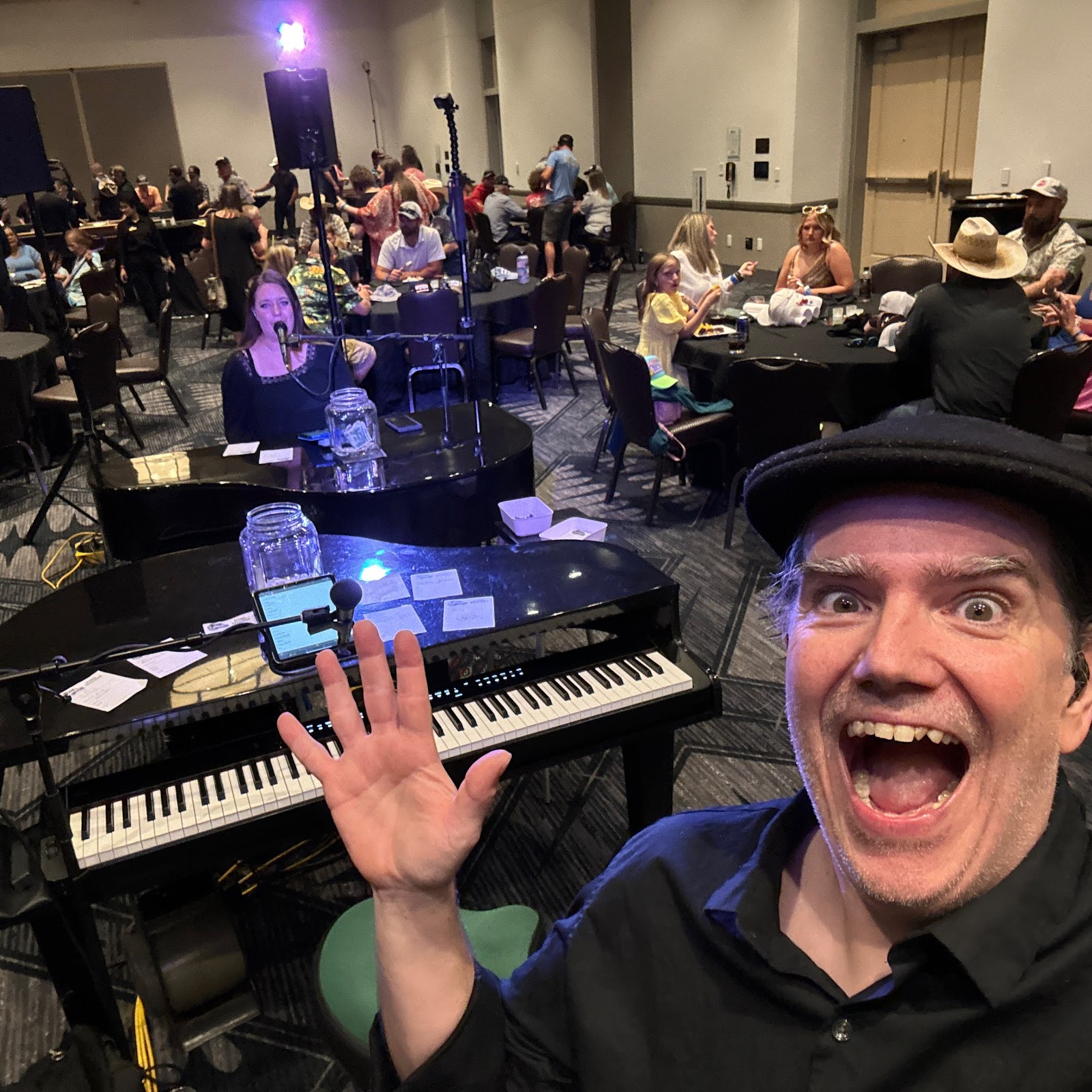 We played a dueling pianos show for a corporate event tonight in Round Rock, TX, at the Kalahari Resort. We’ve played for this group 3 or four times in the past, and we always have a good time with them. Midway through the show, a woman came and asked me if a young lady named Paisley could come play “Piano Man”, so I said “Of course”! She ran and got her own harmonica and head gear and sounded great. I got to play “Peaches” for a very happy young man and his father. After our show wrapped up, one of the people who hired us asked if we had our caricature done yet. He pointed us towards William, the butt sketch artist. For posteriors sake, I’ve blurred his sexy rendering of both of our back sides. It made it even funnier. After the show, we headed into Redd’s Piano and watched Tammy Tanner play a few songs and saw the cutest service pup, then drove to Darwin’s Pub where we caught a couple tunes by the always entertaining team of Michael Carrandi and Joe Resnick, headed down 6th Street to Pete’s and said hi to our friends Mike Atkins and Chris Saucedo, and then drove to In-N-Out on the way home. We packed it in today!