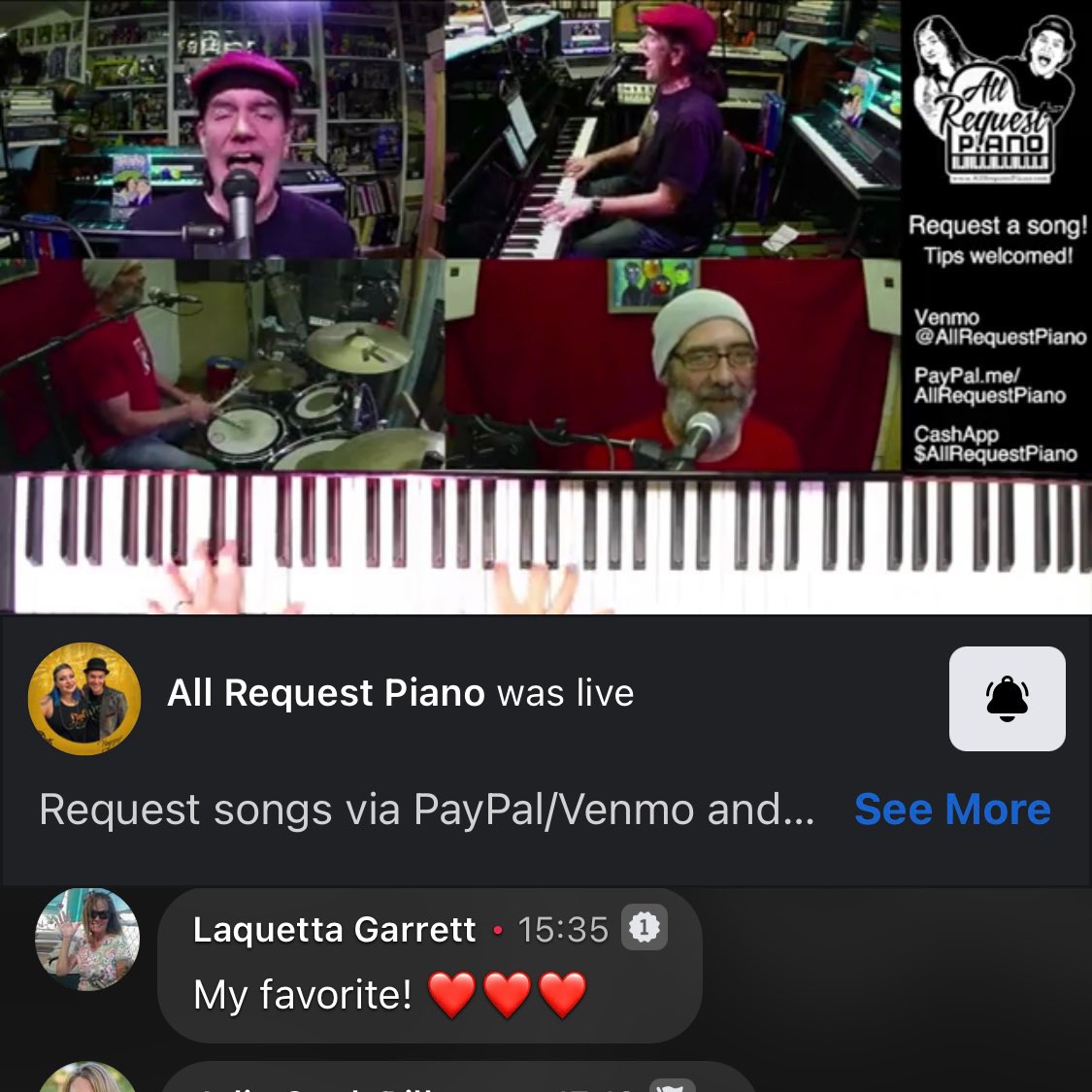 Chris Wallis suggested we do a livestream, so I jumped at the opportunity to do it! We played two short livestreams, and the first was on AllRequestPiano where we took requests from the people watching and played them. We also threw in some fun, unusual tunes just because. “Sussudio”, “Burning Down The House” and “Don’t Come Around Here No More” were three of my oddball favorites from today.